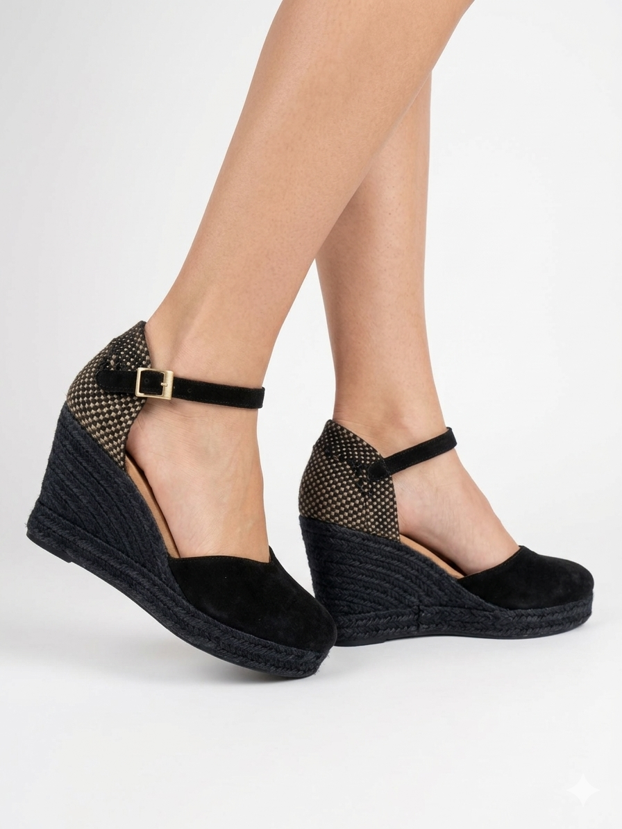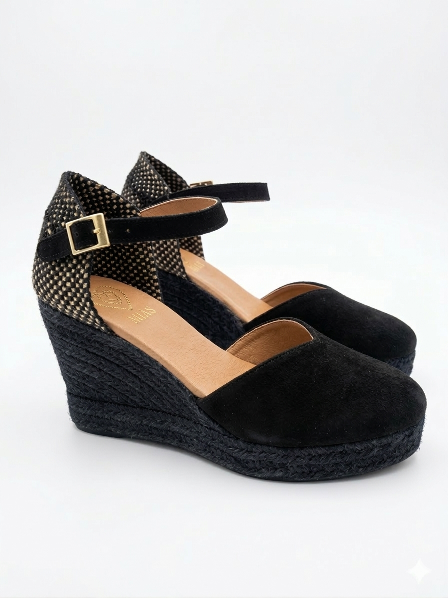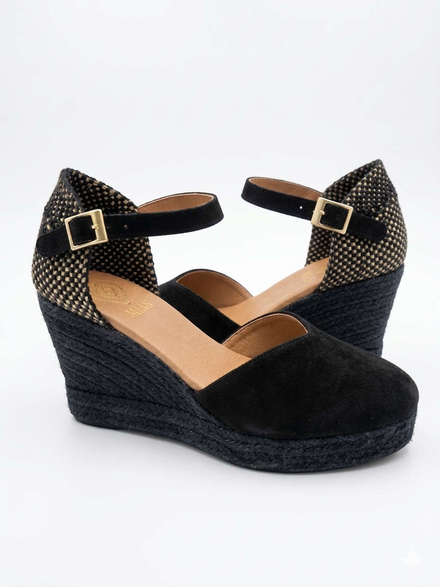 Lleva tu estilo a un nivel superior con estas exclusivas cuñas de MIAS. Un diseño que combina la esencia artesanal del esparto con elegancia y sofisticación. Confeccionadas en piel de ante negro premium, con talón...