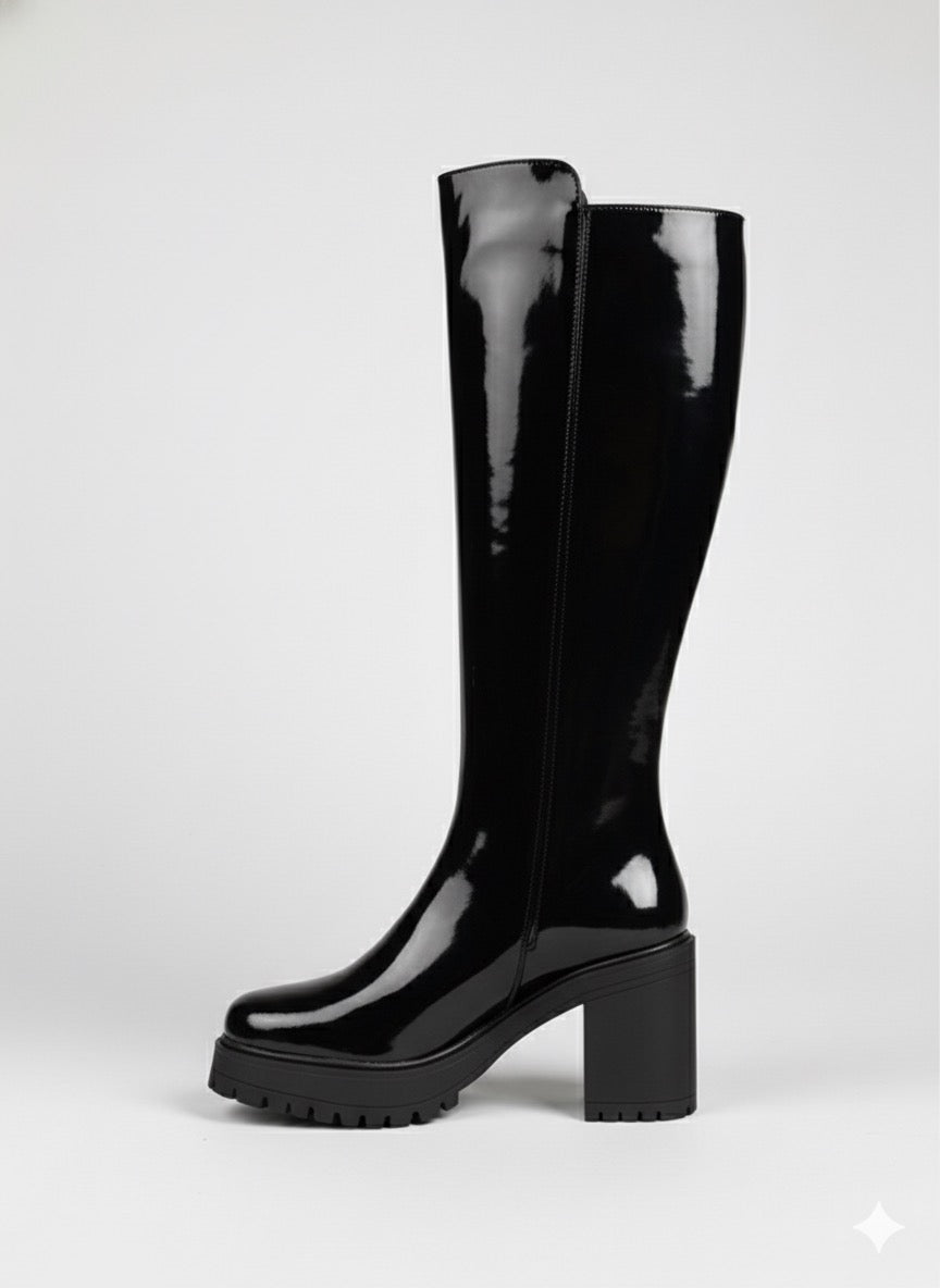 Bota alta REBECA en piel de charol negra, con fuelle elástico para mejor ajuste y cremallera lateral para un calce fácil. Interior con plantilla acolchada en piel para máximo confort. Tacón ancho estable y suela dentada antideslizante. Elegante, cómoda y perfecta para el día a día.